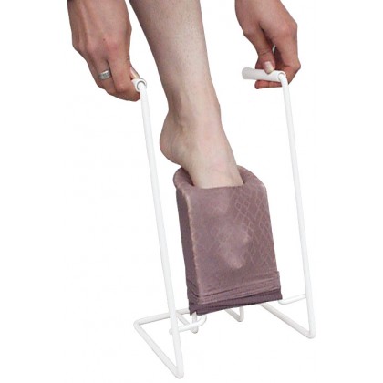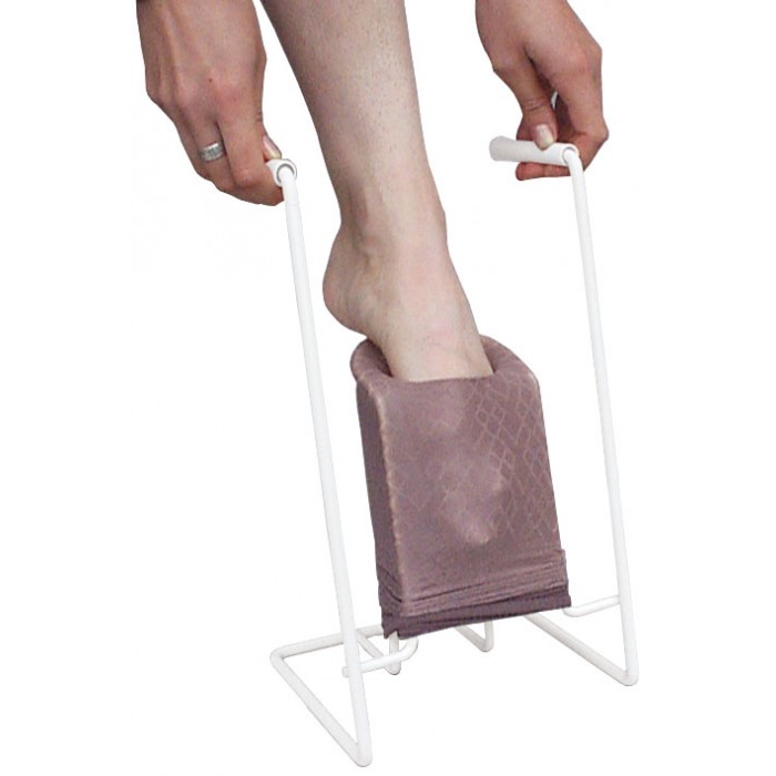 Designed to take the struggle out of putting on compression stockings. Made of steel with smooth plastic coating. Convenient handles greatly assist in pulling the stocking up. Simply stretch the stocking over the column, insert toes and pull up with a continuous motion. Stocking Aids reduce bending and increase independence while dressing. Inside column width is 4" (10cm).