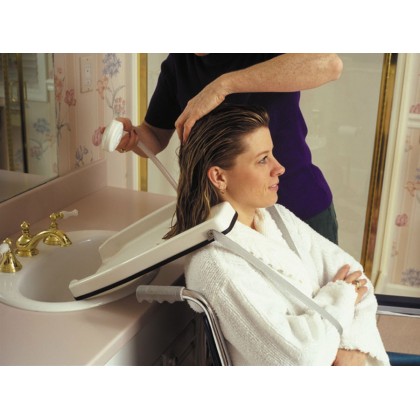 This plastic tray mounts on the shoulders and is held in place via a 35" (89 cm) strap which hangs in front of the user for them to hold. It can be used in any home sink, bathroom or kitchen, or with any shampoo basin. The 5" (13cm) wide curved neck rest provides a comfortable support. Water poured on the hair drains into the sink or basin. The tray is 17 3/4" (45cm) long x 13" (33cm) wide with 1 1/2" (4cm) high sides.