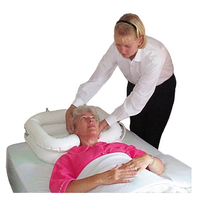 Inflatable shampoo basin makes it possible to wash a person's hair without removing them from bed. The patient's neck and shoulders are cushioned in the inflatable rings. Handy for home or institutional use. Inflates by mouth or by air pump. Made of heavy duty vinyl. Complete with 4'' drain hose, plug and instructions. Inflates to 28" (71cm) wide x 24" (61cm) long x 6" (15cm) deep.