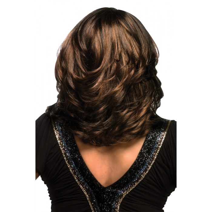 AUTUMN-V is a 15 inch wig with side zig zag part, straight top, and loose curl at the end of the side and the back. Pure stretch cap stretches throughout the entire perimeter inside which lets you wear it comfortably all day long without causing unwanted headache. This style is reminiscent of today's super glam. Make a dramatic statement with this voluminous, layered style.