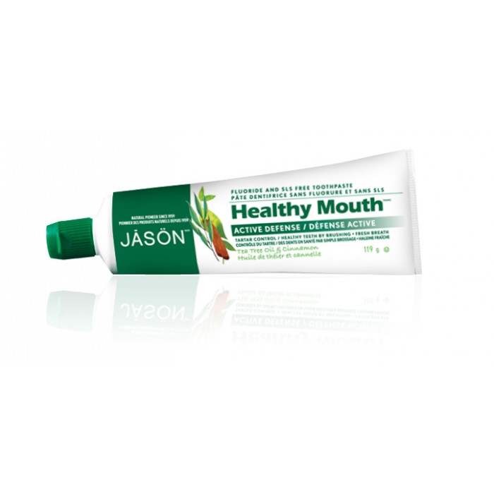Healthy Mouth® All Natural Toothpaste guards your teeth and gums from sugar acids and tooth decay. Tea Tree Oil, a well-known antimicrobial and antiseptic agent, helps defend the entire oral cavity from the bacterial growth that could lead to periodontal disease. Natural Grapefruit Seed and Perilla Seed Extracts help reduce tartar build-up while Aloe Vera Gel soothes gum irritation. A refreshing Cinnamon chill keeps your breath fresh all day. For a healthy smile and fresh breath, use Jason Healthy Mouth® toothpaste and mouthwash twice a day.