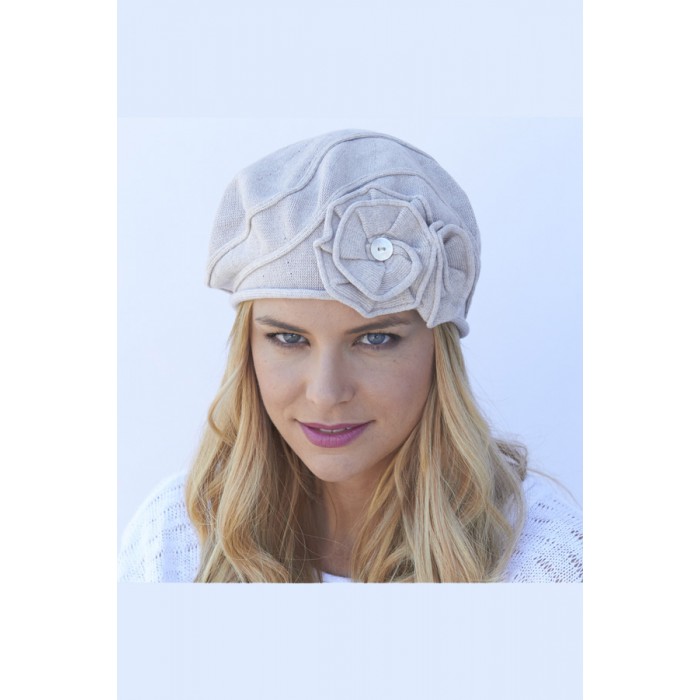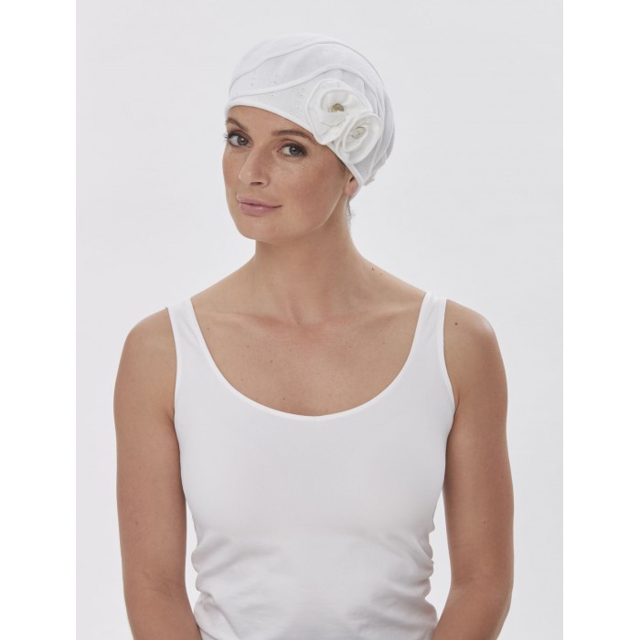 This cotton beret hat is both simple and elegant. It is beautifully decorated with a side Dhalia flower. For women following Chemo Cancer treatment (Chemotherapy), this hat hat adds a fine touch compared to basic berets.