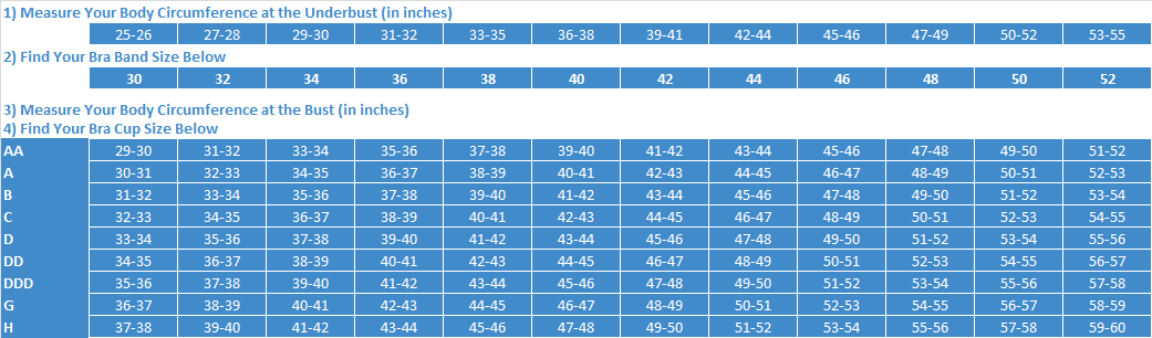 2. With bust measure, locate your cup size in the sizing chart below.