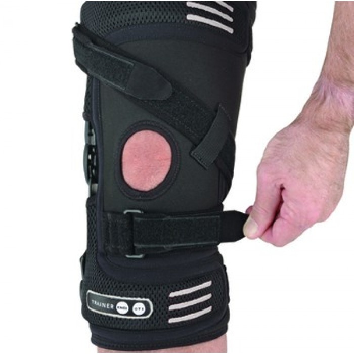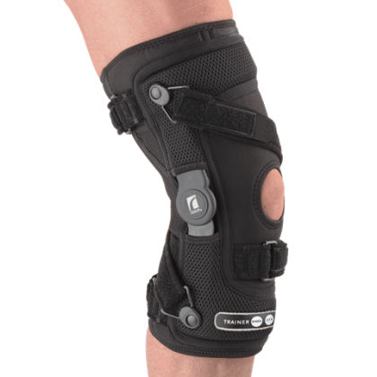 This cost-effective, single-upright brace is the perfect option to treat moderate MCL injuries, or mild combined ligament instabilities. With a diagonal Dynamic Force Strap that tightens when the knee is extended, it resists valgus forces and minimizes axial rotation. Its carbon steel range-of-motion hinge and injection-molded carbon shells are extremely durable, and an Adjustable Tibial Strap provides tibial capture and improved suspension. The Trainer is an excellent option for use in activities where a medial hinge may impede performance, or a padded shell covering is required.