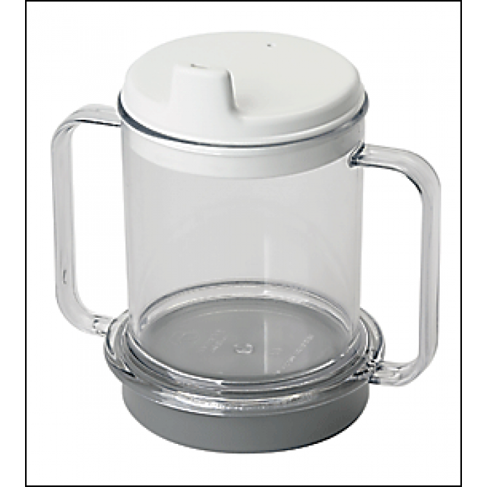This mug has a weight of 10 oz.(285 g) in its base. The combination of the weighted base and double hand grips makes this an extremely useful device to manage hand tremors. It is transparent to instantly show the level of contents and has a wide base to resist tipping. Do not submerge in water when cleaning this cup. Pat. Pend.