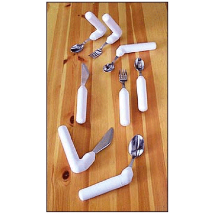 Therapists and consumers have commented on our cutlery over the years and we have listened. The Featherlite line of cutlery is the result. This line of cutlery is very light weight. The average weight is 48 grams (1.7oz). The handles are one inch in diameter and slightly tapered and textured for easy gripping. They are totally sealed to prevent water seepage and are dishwasher safe. The stainless steel utensils have been designed for use by persons with disabilities. The fork has short tines with rounded tips. The knife blade can be used as a rocker knife or as a regular knife. Spoon bowls are not too large. The angle of the left and right offset have been designed to minimize wrist movement. The Ergo utensils in this line compose a complete set of rocker knife, fork, teaspoon and soupspoon. The addition of this grip angle further enhances our ability to solve gripping problems at meal time. The Featherlite line totally embodies our motto, Independence by Design.