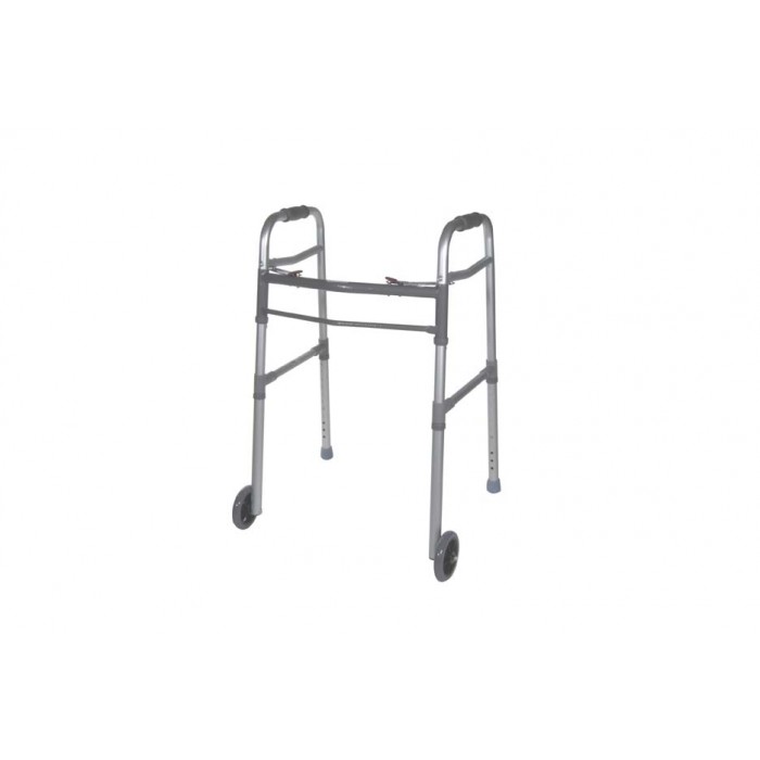 This Universal Adult/Junior Deluxe Folding, Two Button Walker with 5" caster wheels is made from a sturdy 1" anodized aluminum construction to ensure maximum strength while also remaining lightweight. The walker's height can be adjusted and the side brace adjusts with the height to provide additional stability. The easy push-button mechanism may be operated by fingers, palms or side of hand, and each side operates independently to allow easy movement through narrow spaces and provides greater stability while standing. This Universal Deluxe Folding Walker comes standard with wheels, rear glide caps and glide covers to ensure users with a smooth ride over most surfaces.