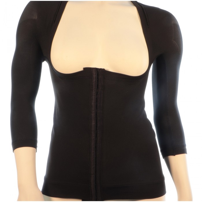 Wear the post op compression arm sleeves after an arm liposuction or arm lift. To facilitate its use by patient, this post surgical arm compression garment is designed to be worn as a jacket or vest. The hook and eye front closure is width adjustable, thanks to the three adjustment levels. The specialized compression fabric is made from a medical grade compression. It is breathable, soft and effective after an arm lift or lipo.